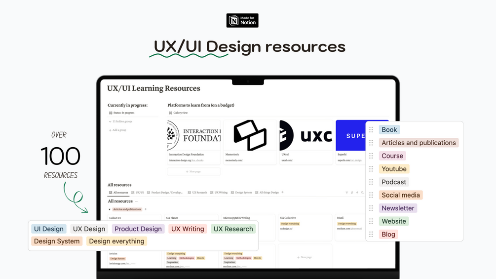 Whether you’re just starting out or a professional looking to stay ahead of the curve, this Notion database is your one-stop destination for everything UX/UI, Product Design, UX Research, UX Writing, Design Systems, and more.